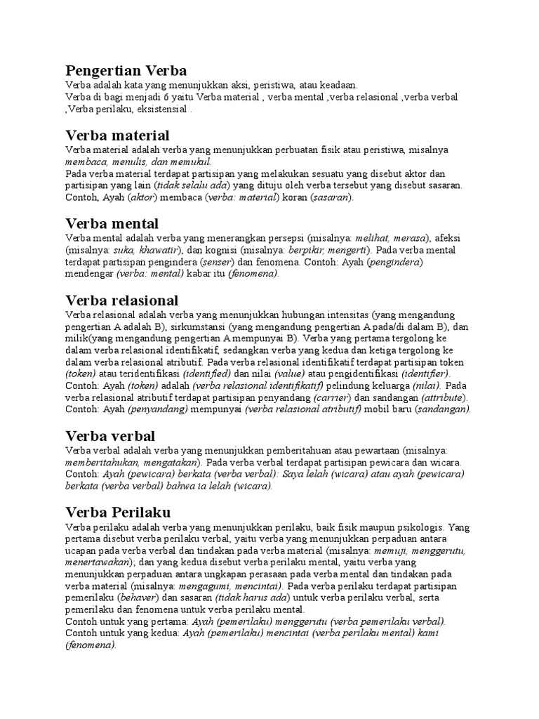 Deklaratit Verba Material Lihat Cara Penyelesaian Di Qanda from thumb-m.mathpresso.io Verba tingkah laku adalah verba (kata kerja) yang mengacu pada tindakan yang dilakukan dengan ungkapan. Dia menentukan ketatabahasaan pada seluruh kalimat. Verba yang menunjukkan hubungan intensif (yang mengandung pengertian a adalah b), sirkumstasi(yang mengandung pengertian a pada atau didalam b) dan milik(yang mengandung pengertian a mempunyai b). Verba material adalah suatu bentuk kata kerja berimbuhan yang menunjukkan adanya tindakan fisik, atau suatu perbuatan yang secara fisik dilakukan oleh seseorang atau partisipan. Verba atau kerja ini dibagi menjadi dua jenis yaitu verba material dan verba tingkah laku. Berikut adalah beberapa contoh dari verba material yang berada di dalam sebuah, antara lain: Verba material adalah suatu bentuk kata kerja yang berimbuhan dan mengacu pada tindakan fisik atau perbuatan yang dilakaukan secara fisik oleh partisipan. Aturan dalam penulisan kalimat verbal juga terdapat dua syarat utama, yaitu adanya subjek (s) dan predikat (p).