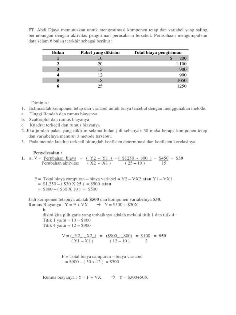 Yang akan saya bahas sekarang hanya 2 saja, yaitu biaya tetap dan biaya variabel. Sehingga biaya variabel akan relevan dengan pengingkatan volume produksi yaitu dua kali lipat sehingga biaya variabel menjadi rp 1.300.000. Biaya variabel akan naik saat produksi meningkat dan turun saat produksi juga menurun, tidak seperti biaya tetap yang sifatnya tidak tergantung dengan proses produksi. Nah setelah jumlah produksi atau penjualan terlampaui, maka biaya berubah menjadi biaya variabel. Biaya variabel adalah suatu biaya yang dikeluarkan secara tetap dan berkala namun jumlahnya berubah dan tidak tetap bergantung pada volume kegiatan perusahaan. 05/08/2021 · biaya variabel adalah biaya yang mengikuti volume produksi. Biaya ini merupakan biaya campuran dari biaya tetap dan biaya variabel. Biaya tetap adalah biaya yang umumnya selalu konstan, bahkan di masa sulit. Biaya ditetapkan untuk tingkat produksi atau penjualan tertentu. 20/05/2010 · ada biaya tetap, biaya variabel, biaya incremental, biaya langsung, biaya tidak langsung, dan sebagainya. Dalam mencari break even point (bep), anda harus bisa membedakan dua jenis biaya, yaitu biaya tetap dan biaya variabel.biaya tetap adalah biaya yang tidak berubah meskipun terjadi perubahan tingkat aktivitas dalam jangka pendek. 24/02/2021 · berdasarkan variabilitas, terdapat tiga klasifikasi biaya, yaitu biaya tetap, biaya variabel dan biaya semi variabel. Sewa gedung, perlengkapan kantor, asuransi dan gaji karyawan.